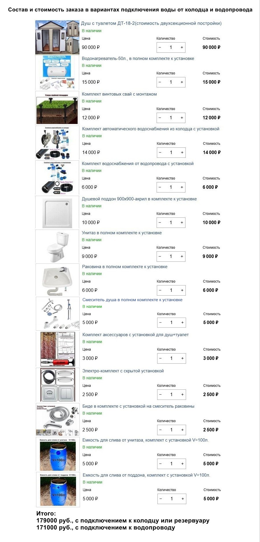 Весь комплекс сборки и размещения заказанного оборудования выполняется в течении рабочего дня на заранее подготовленной заказчиком площадке: периметром не менее 3х3 м.; с свободным водопроводным краном 1\2"на территории участка, или иным источником воды(колодец, резервуар); наличия электроэнергии.На вкрученные сваи электро механическим способом(сваекрутом) укрепляется основание и комплект стен; устанавливается кровля; по подготовленным местам крепления монтируется сантехника с подключением воды через проточный фильтр к внутренней системе раздачи воды из полипропиленовых труб(готовится под заданные элементы в заказе и скрыта под обшивкой задней стенки см. фото), фильтр необходим для увеличения срока службы бойлера, подключается к водопроводу(при заборе из колодца монтируется автоподача из заказа с возможностью последующей самостоятельной разводкой ко всем объектам на участке); сливные отводы в герметично закрытые перфорированные емкости, вкопанными за постройкой; крепятся в конкретные места аксессуары; коробка электроподключения на боковой стене уличной стороны с подсоединенным удлинителем(стационарное подключение производится местным специалистом); проводится инструктаж по эксплуатации в период плюсовых температур с проверкой работоспособности всех систем в целом; подписывается акт приема-передачи изделия.